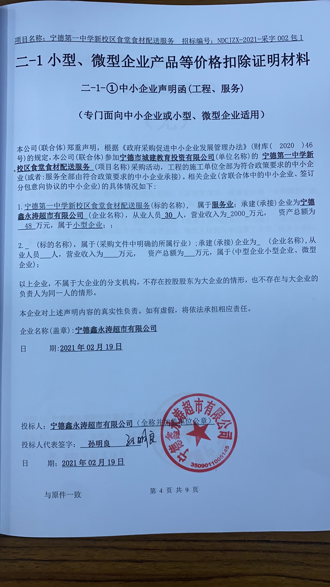 | 1 | 寧德鑫永濤超市有限公司 | 寧德第一中學(xué)新校區(qū)食堂食材配送服務(wù) | 寧德第一中學(xué)新校區(qū)食堂食材配送服務(wù)合同包1主、副食品 | 投標(biāo)人須根據(jù)實際情況安排固定車輛(至少1輛可隨時調(diào)派的車輛)和1名固定司機、1名送貨人員負責(zé)送貨上門等,具體詳中標(biāo)人的投標(biāo)文件。 | 供應(yīng)合同期(服務(wù)期限)為兩年(法定工作日),本項目合同一年一簽,采購人有權(quán)對中標(biāo)人的前一年度的服務(wù)進行考核并覺得是否續(xù)簽合同,具體起止時間以合同簽定為準(zhǔn)。 | 中標(biāo)人所提供產(chǎn)品必須符合“中華人民共和國食品安全法”要求等,具體詳中標(biāo)人的投標(biāo)文件。 |